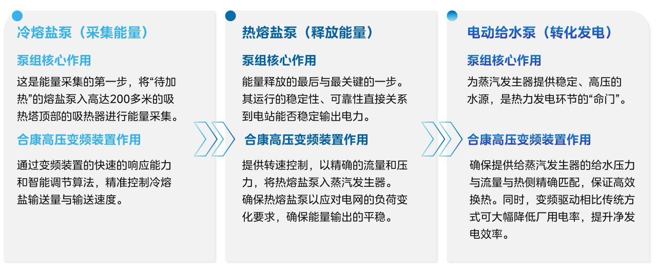 在這一復(fù)雜的光熱發(fā)電系統(tǒng)中,合康新能高壓變頻裝置承擔(dān)著對關(guān)鍵設(shè)備的核心調(diào)控重任,通過強(qiáng)大可靠的變頻技術(shù)將這三大關(guān)鍵泵組串聯(lián)起來實(shí)現(xiàn)高效穩(wěn)定運(yùn)轉(zhuǎn),構(gòu)建了從能量采集儲存、釋放到電能轉(zhuǎn)換的完整能量流: